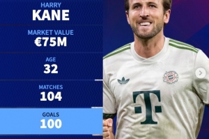 在拜仁4-0不萊梅的德甲聯賽中,凱恩完成梅開二度,打進自己在拜仁的第100球,同時也躋身為單一俱樂部最快打進100球的前十球員行列。