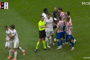 體育資訊09月28日訊 馬競vs皇馬最后時(shí)刻爆發(fā)沖突,馬斯坦托諾被拉開,慢鏡頭給到,馬斯坦托諾一腳爆射場邊。