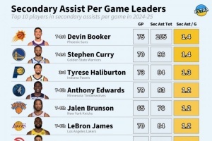 體育資訊9月28日訊 今天,數據媒體Extra列出了24-25賽季場均間接助攻(助攻傳球之前的那次傳球)前10,具體為: