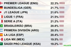 體育資訊9月29日訊 CIES盤點各聯賽高速跑動距離占比排名,英超居首,德甲第二,西甲僅第八。(高速跑動定義:>15公里/小時)
