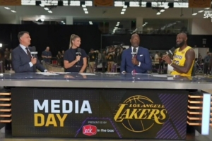 在即將結(jié)束與湖人官方轉(zhuǎn)播商Spectrum SportsNet的專訪時(shí),主持人問道:“明年媒體日咱們?cè)僖姡俊?/p>