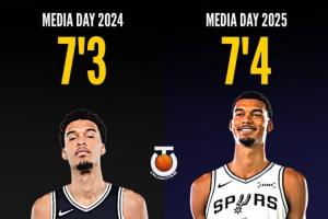 美媒從名單上發現,21歲的文班亞馬長高了1英寸,去年媒體日時他的身高是7英尺3英寸(約2米21),現在是7英尺4英寸(約2米24)。