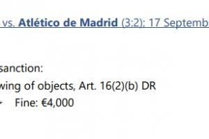 體育資訊10月01日訊 歐冠首輪比賽,利物浦3-2戰勝馬競。本場比賽中,利物浦因為球迷投擲物品,違反《歐足聯紀律準則》第16(2)(b)條,俱樂部被罰款4000歐元。