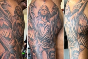他在靠近肩膀處加上了一個天使圖案,往下是大衛與歌利亞的場景,以及耶穌扛著十字架的圖案。