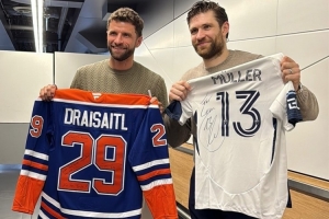 穆勒與德國冰球選手德賴塞特爾交換球衣并合影,后者效力于NHL埃德蒙頓油人隊,也是司職前鋒,兩人社媒轉發合照,并互稱對方為傳奇。