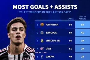五大聯(lián)賽左邊鋒近一年參與進球榜(所有賽事):