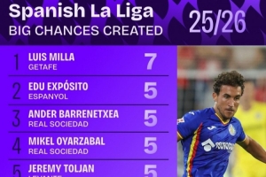 體育資訊10月7日訊 日前,Squawka統計了本賽季西甲創造進球機會次數排行,拉菲尼亞、居勒爾4次并列第六。