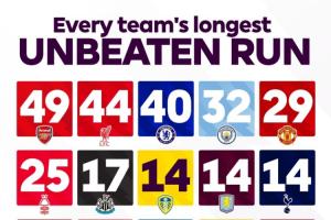 排在槍手紀(jì)錄之后的是曾44場不敗的利物浦和40場不敗的切爾西。