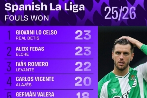 體育資訊10月7日訊 日前,Squawka統計了本賽季西甲被犯規次數排行,洛塞爾索23次居首,朱利亞諾-西蒙尼18次并列第五。