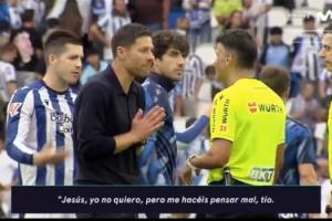 比賽第32分鐘,皇家社會反擊機會,赫伊森犯規(guī),主裁判曼薩諾果斷出示紅牌。轉(zhuǎn)播方拍到了皇馬主帥阿隆索與裁判曼薩諾溝通的內(nèi)容。