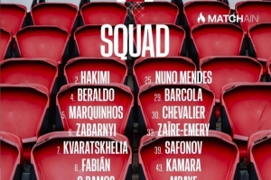 后衛:2-阿什拉夫、4-貝拉爾多、5-馬爾基尼奧斯、6-扎巴爾尼、21-盧卡斯-埃爾南德斯、25-努諾-門德斯、43-諾哈姆-卡馬拉、51-帕喬