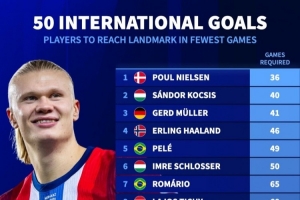 體育資訊10月13日訊 在上周對陣以色列的世預賽中,哈蘭德上演帽子戲法,這讓他成為歷史上第4快打入國家隊第50球的球員。作為對比,梅西用了107場才達到這一里程碑,而C羅則用了114場。德轉列出了達成國家隊50球所用場次最少的球員?。