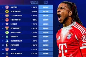 1、拜仁慕尼黑,總身價9.52億歐元,漲5.0%