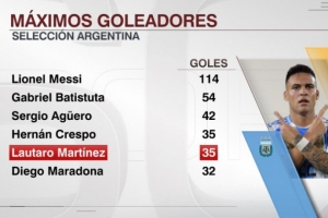 體育資訊10月15日訊 勞塔羅在阿根廷隊大勝波多黎各的友誼賽中梅開二度,根據ESPN統計,勞塔羅阿根廷隊進球數追平克雷斯波,并列隊史第四。