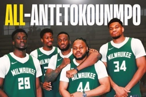 美媒Clutch Points曬出了一張全字母哥陣容的P圖,并寫道:“字母哥的另一位弟弟科斯塔斯目前效力于奧林匹亞科斯,他大哥弗朗西斯在轉行踢足球前也打過籃球。”