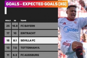 3.塞維利亞:15球,預期進球數8.1,正負值+6.9