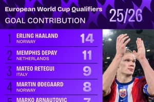 體育資訊10月15日訊 Squawka統(tǒng)計(jì)了本屆歐洲世預(yù)賽球員參與進(jìn)球(助攻+進(jìn)球)的數(shù)量,并列出榜單,哈蘭德參與14球居首,德佩參與11球次席。