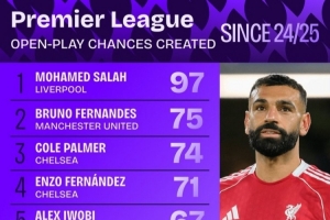 體育資訊10月16日訊 日前,Squawka統計了英超運動戰創造機會次數排行,薩拉赫居首,B費、帕爾默分居二三位。