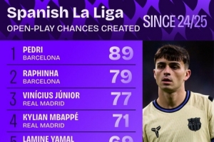 體育資訊10月16日訊 日前,Squawka統計了西甲運動戰創造機會次數排行,佩德里、拉菲尼亞前二,維尼修斯第三。