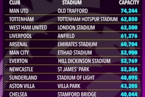 體育資訊10月17日訊 《太陽報》對比上個賽季和本賽季的英超手冊,發現有五支英超俱樂部的球場容量較上賽季有所變化。