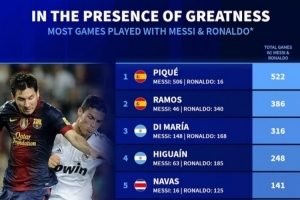 1.皮克,與梅西同場506次,與C羅同場16次,合計522次