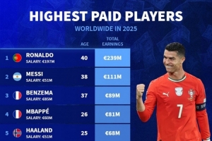 體育資訊10月18日訊 德國轉會市場統計了球員2025年的收入,并列出榜單,C羅2.39億歐居首,梅西1.11億歐次席。