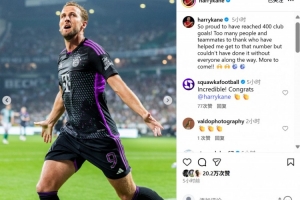 凱恩也在社媒發文紀念這一特殊時刻,寫道:“很自豪能夠完成俱樂部生涯400球,達成這一紀錄得益于太多人的幫助,沒有大家一路的支持我不可能做到。未來還有更多進球!”