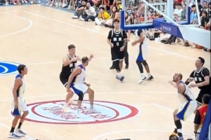 在本場比賽中,周鵬因對手防守趙睿動作過大,揮拳直接把赫羅納男籃的14號干翻。