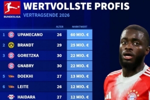體育資訊10月23日訊 《轉(zhuǎn)會市場》統(tǒng)計了合同將在明夏到期的德甲球員身價情況,拜仁中衛(wèi)于帕梅卡諾獨自領(lǐng)跑。