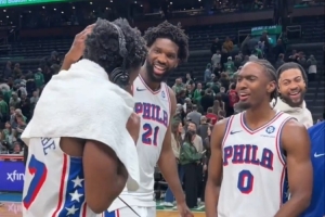 GIF-埃奇庫姆接受采訪,恩比德馬克西等人潑水慶祝