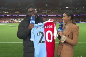 理查茲接到禮物時激動地喊道:“你們給我準備了禮物,這是什么禮物啊?”原來這是一件曼城和阿森納縫合的球衣。