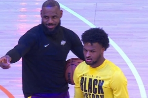 只見詹姆斯從場(chǎng)邊走向正在練習(xí)投籃的布朗尼,并指向場(chǎng)邊:“布朗尼,你媽說她要叫你過去!”布朗尼則立即停止訓(xùn)練,掃視場(chǎng)下媽媽的位置。