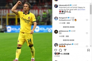 莫德里奇社媒曬出比賽照片,并寫道:“在主場取得重要勝利!很高興攻入我在米蘭的首粒進球。”