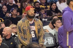據現場記者Dan Woike分享的照片,本場因傷缺陣的詹姆斯身穿小兒子布萊斯在亞利桑那大學的球衣到場觀賽。