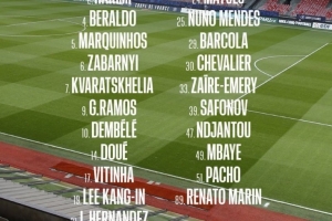 前鋒:7-克瓦拉茨赫利亞、9-貢薩洛-拉莫斯、10-登貝萊、14-杜埃、19-李剛仁、29-巴爾科拉、47-恩賈恩圖、49-姆巴耶