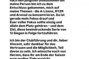 我衷心感謝俱樂部管理層以及您——親愛的文森特給予的信任與共事機會。我誠摯祝愿你們在本賽季末實現所有宏偉目標。同時,我要向眾多送來信息表達支持的朋友們致以真摯謝意。
