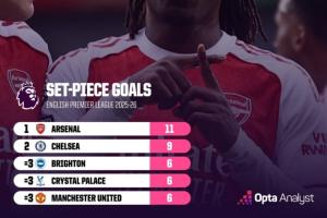 本賽季英超球隊通過定位球破門球隊排行榜↓
