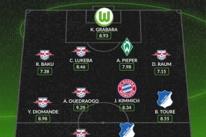 后衛(wèi):巴庫(kù)(萊比錫,7.38分)、盧克巴(萊比錫,8.46分)、阿莫斯-皮佩爾(云達(dá)不萊梅,7.98分)、勞姆(萊比錫,7.15分)