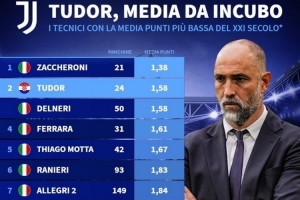 體育資訊10月28日訊 德轉統計表明,圖多爾執教尤文場均1.58分,是21世紀場均積分并列第二少的尤文教練。