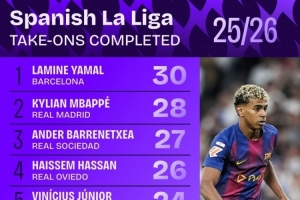 本賽季西甲成功過人榜:亞馬爾30次居首,姆巴佩28次第二