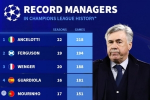 體育資訊9月16日訊 新賽季歐冠即將開打,德轉列主教練執教歐冠場次排行,安切洛蒂218場居首,弗格森、溫格排在二三位。