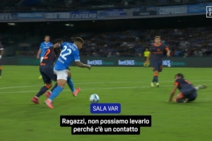 VAR: "確實(shí),迪洛倫佐有介入,但他介入是因?yàn)橐粋€(gè)動(dòng)作……他并不是為了爭取不屬于球的空間而伸腿,而是為了保護(hù)球而伸腿。我們來看一下姆希塔良的動(dòng)作,稍等。看看迪洛倫佐的臉,他正保護(hù)著球。稍等一下,我在核實(shí)。”