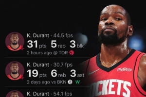 據統計,杜蘭特火箭生涯4場比賽得分破百,隊史第二快,僅次于哈登(3場)。