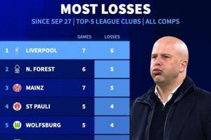 體育資訊10月30日訊 利物浦0-3不敵水晶宮,各項賽事僅7場比賽1勝6負,數據統計顯示,利物浦是同一時期五大聯賽所有球隊中輸球場次最多的。
