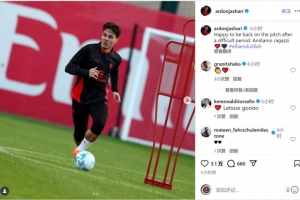 亞沙里社媒曬出訓(xùn)練照片,并寫道:“很高興在度過(guò)一段艱難時(shí)期之后重返球場(chǎng),加油兄弟們!”