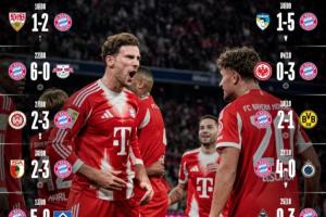 體育資訊11月02日訊 德甲第9輪,拜仁3-0大勝勒沃庫森,新賽季15連勝,一共攻入54球。