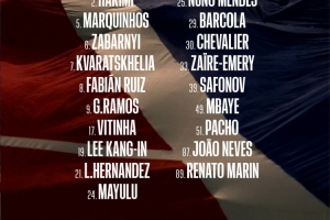 巴黎歐冠大名單:2-阿什拉夫、5-馬爾基尼奧斯、6-扎巴爾尼、7-克瓦拉茨赫利亞、8-法比安-魯伊斯、9-貢薩洛-拉莫斯、17-維蒂尼亞、18-李剛仁、21-盧卡斯-埃爾南德斯、24-馬尤盧、25-努諾-門德斯、29-巴爾科拉、30-舍瓦利耶、33-小埃梅里、39-薩福諾夫、49-姆巴耶、51-帕喬、87-若昂-內維斯、89-馬林