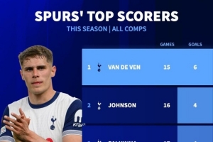 德國轉會市場統(tǒng)計了本賽季熱刺隊內球員的進球數(shù)量,并列出榜單,中衛(wèi)范德芬6球居首。