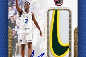 在賽后,他比賽中穿著的球鞋已經(jīng)被聯(lián)盟授權(quán)方拿走并裁切了一部分,做成了僅此一張的首秀球星卡。