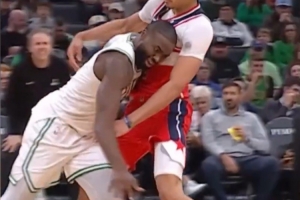 相關新聞>>>又一個受害者??杰倫·布朗撞到K·喬治 發際線粉全粘白T恤上了